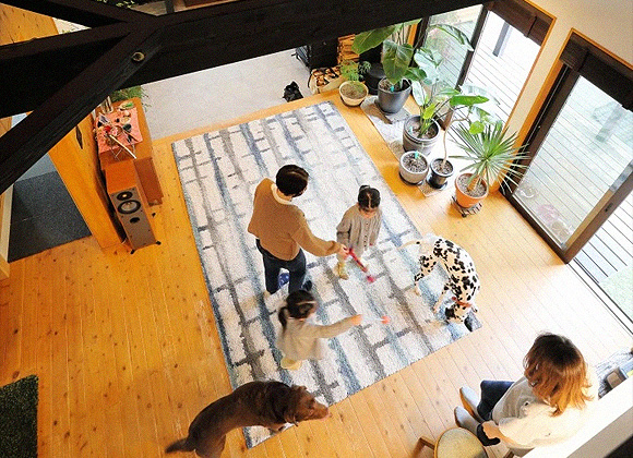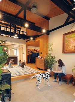 LDKの掃き出し窓を開け放つと、ロフトへと風が抜ける開放的な大空間が広がり、そこはご夫婦と愛猫イブちゃんがもっともリラックスできる場所に。